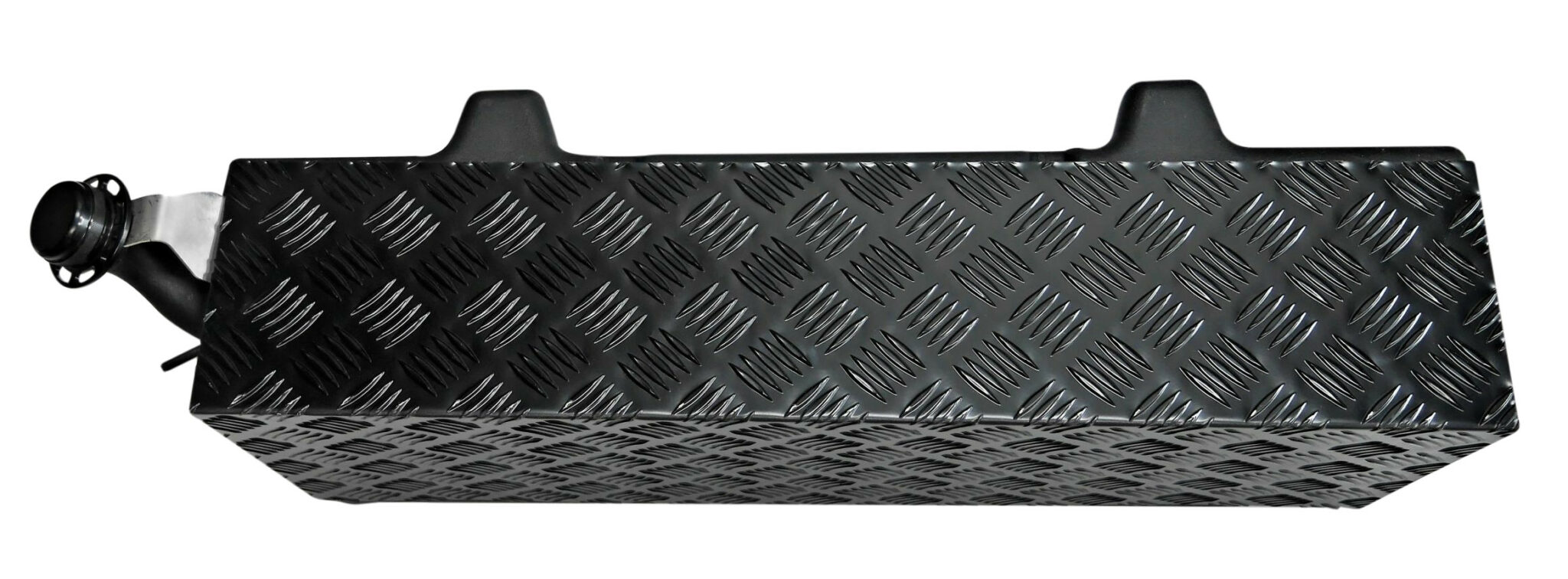 The underfloor fuel tank is hard mounted to the vehicle’s chassis and can hold 15L of diesel. Dimensions are 1000mm(l) x 300mm(w) x 250mm(h). It includes all mounting brackets and bolts and a black stone guard. Designed specifically to sit under the floor between the chassis rail and the edge of a van. This tank makes maximum use of available space. It is made of super thick poly and includes outlet spigot, breather tube, lockable cap and bottom/side stone guard. Note end stone guards are not included and the stone guard is only available in black.